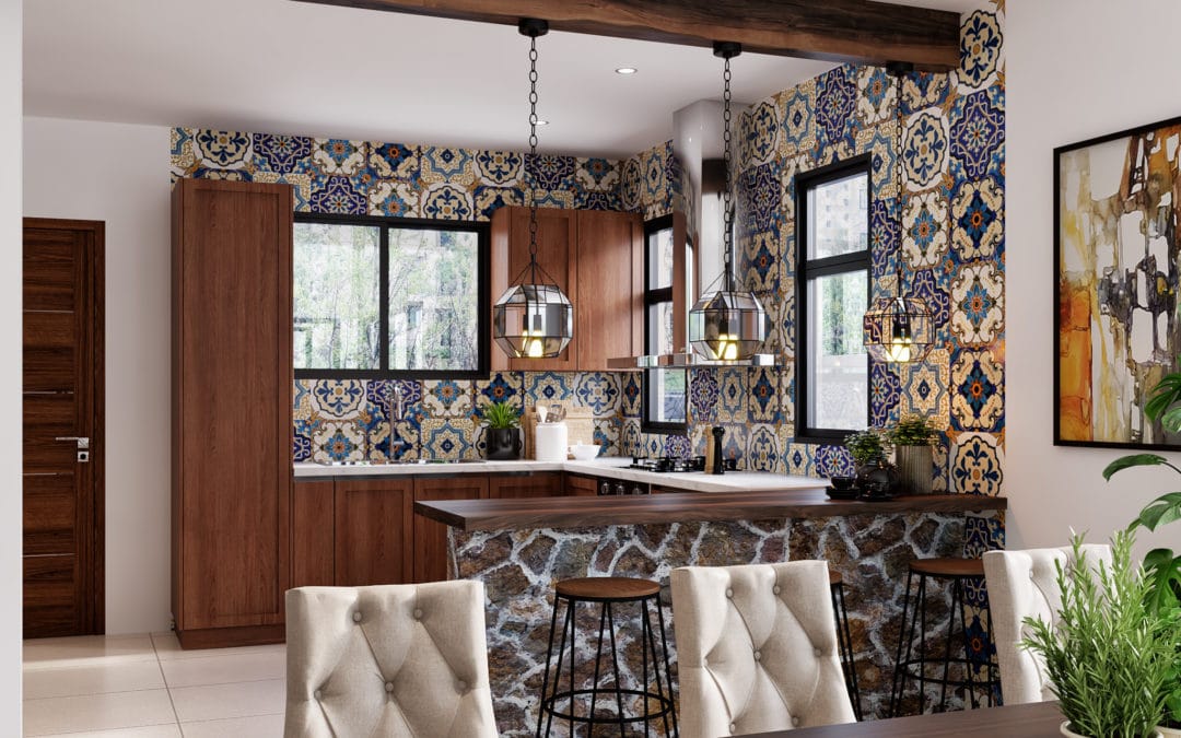 Step inside this amazing kitchen design. Inspired by Mediterranean dark wood door finish and light floor kitchen, colorful patterned tiles, an island gray countertops, topped with exquisite lighting.